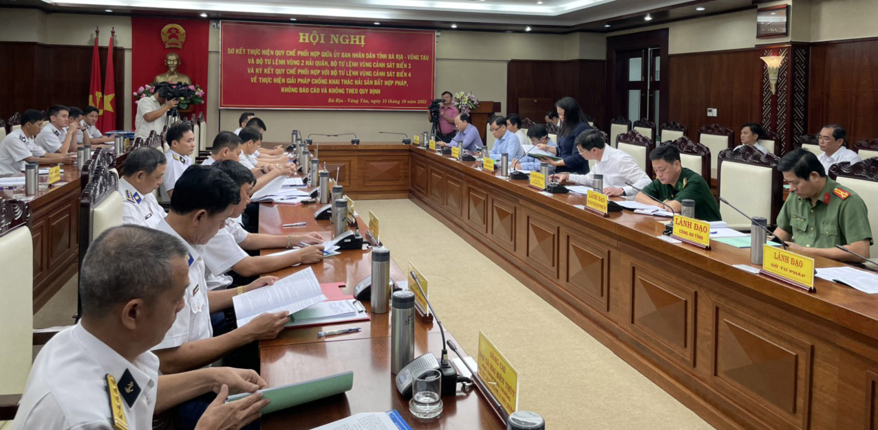 Tại hội nghị, các đại biểu nghe báo cáo kết quả thực hiện Quy chế phối hợp đã được ký kết giữa UBND tỉnh và Bộ Tư lệnh Vùng 2 Hải quân, Bộ Tư lệnh Vùng Cảnh sát biển 3 trong công tác quản lý các hoạt động liên quan đến lĩnh vực thủy sản; những khó khăn, vướng mắc trong quá trình triển khai thực hiện chống khai thác IUU trên địa bản tỉnh Bà Rịa-Vũng Tàu.
