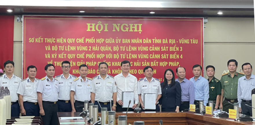 Sáng 15/10, tại Văn phòng UBND tỉnh Bà Rịa-Vũng Tàu đã diễn ra Hội nghị Sơ kết thực hiện Quy chế phối hợp giữa UBND tỉnh Bà Rịa-Vũng Tàu và Bộ Tư lệnh Vùng 2 Hải quân, Bộ Tư lệnh Vùng Cảnh sát biển 3 và ký kết Quy chế phối hợp với Bộ Tư lệnh Vùng Cảnh sát biển 4 về thực hiện giải pháp chống khai thác hải sản bất hợp pháp, không báo cáo và không theo quy định (IUU).