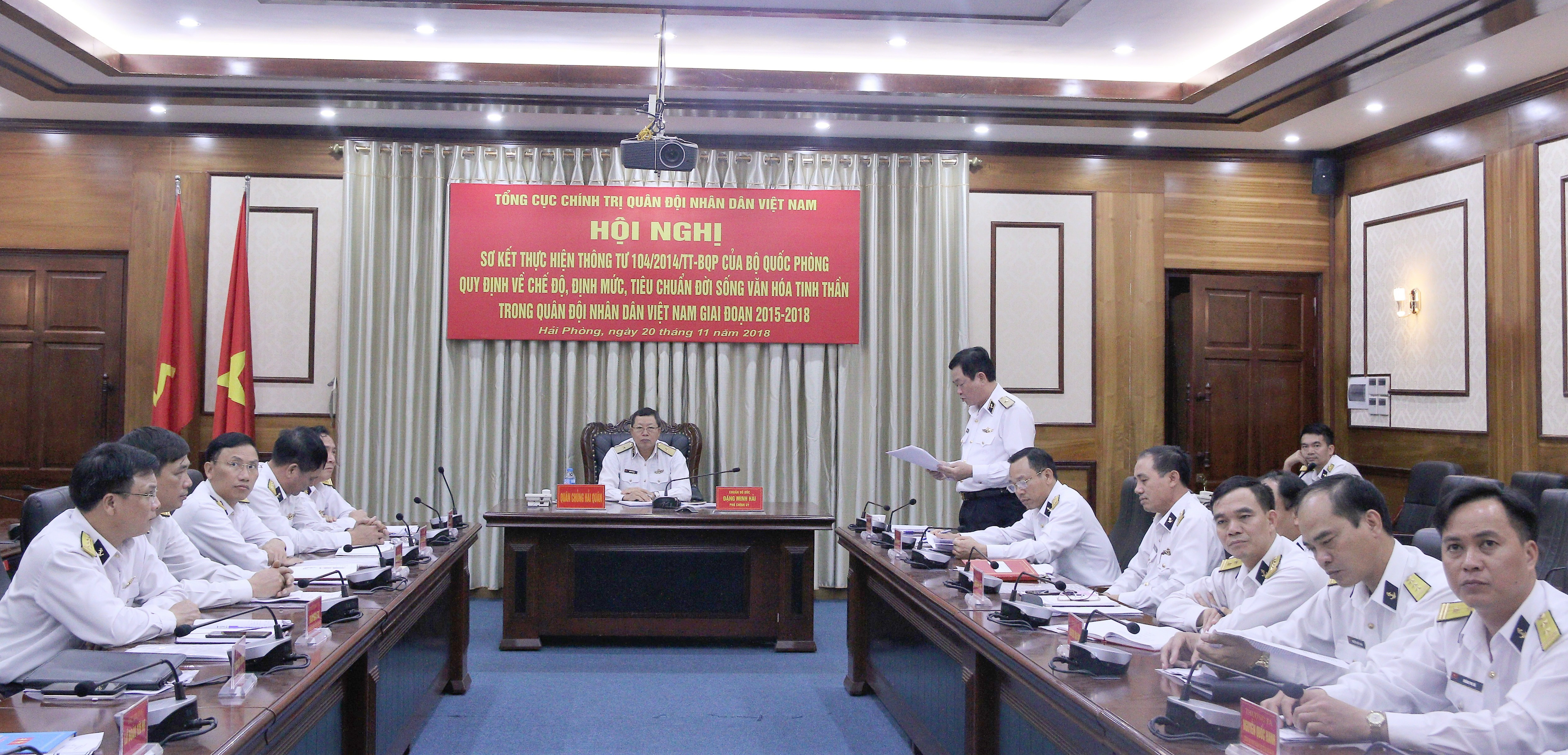 Chiều 20-11, Tổng cục Chính trị Quân đội nhân dân (QĐND) Việt Nam tổ chức Hội nghị trực tuyến Sơ kết thực hiện Thông tư 104/2014/TT-BQP của Bộ Quốc phòng quy định về chế độ, định mức, tiêu chuẩn đời sống văn hóa, tinh thần trong QĐND Việt Nam giai đoạn 2015-2018 tại 29 điểm cầu.