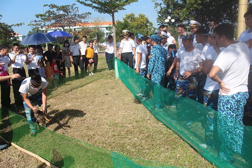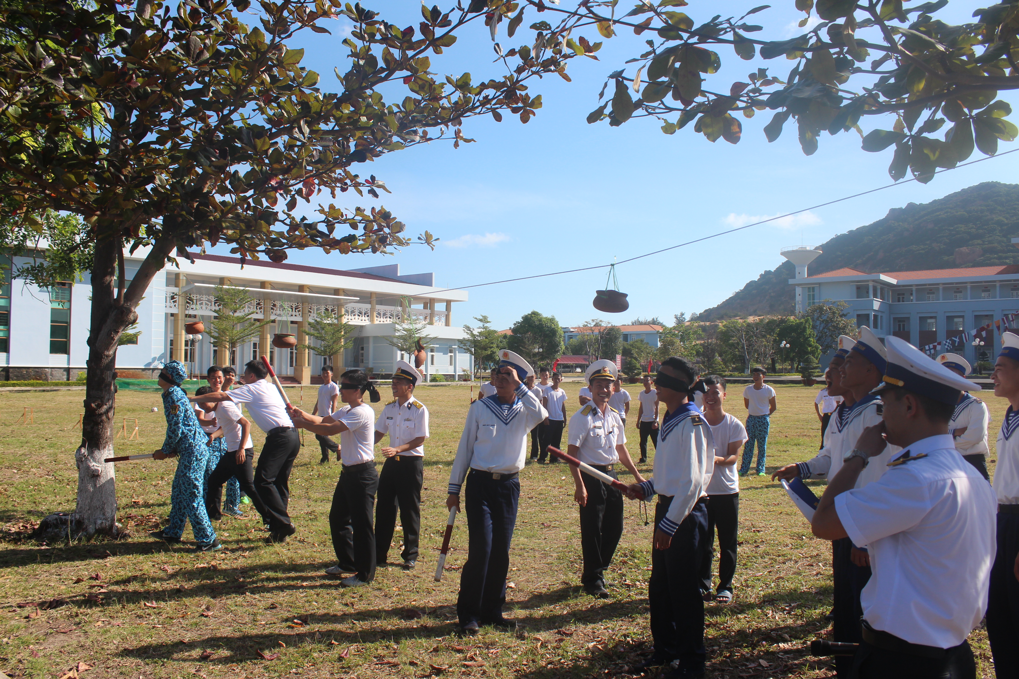 Cán bộ, thủy thủ tích cực hưởng ứng trò chơi đập niêu và bịt mắt bắt vịt