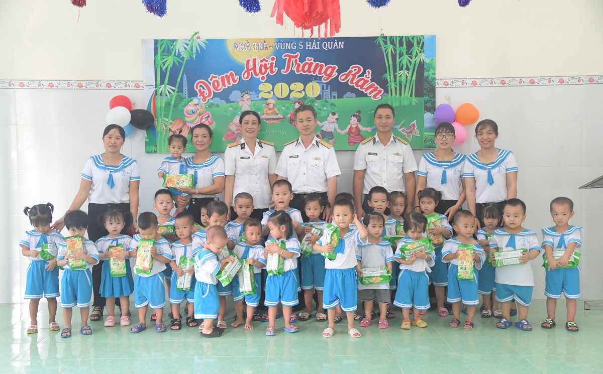 Thủ trưởng Phòng Chính trị Vùng 5 Hải quân tặng quà cho các cháu Nhà trẻ Vùng