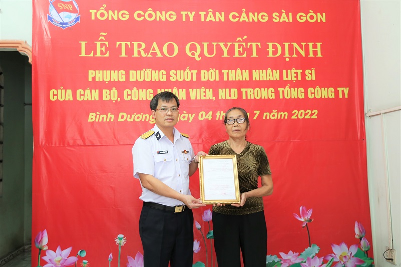 Chiều 4/7, tại TP. Thuận An (Bình Dương), Tổng công ty (TCT) Tân cảng Sài Gòn tổ chức Lễ trao quyết định phụng dưỡng suốt đời thân nhân liệt sĩ. Đại tá Nguyễn Năng Toàn, Bí thư Đảng ủy, Chủ tịch Tổng công ty chủ trì.