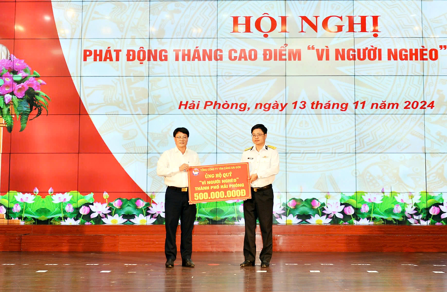 Sáng 13/11, tại Hội nghị phát động tháng cao điểm “Vì người nghèo” năm 2024 do UBND và UBMTTQ Việt Nam TP. Hải Phòng tổ chức, thừa ủy quyền của Tổng công ty Tân cảng Sài Gòn, Chi nhánh Tân cảng miền Bắc đã trao 500 triệu đồng ủng hộ Quỹ “Vì người nghèo” của thành phố.