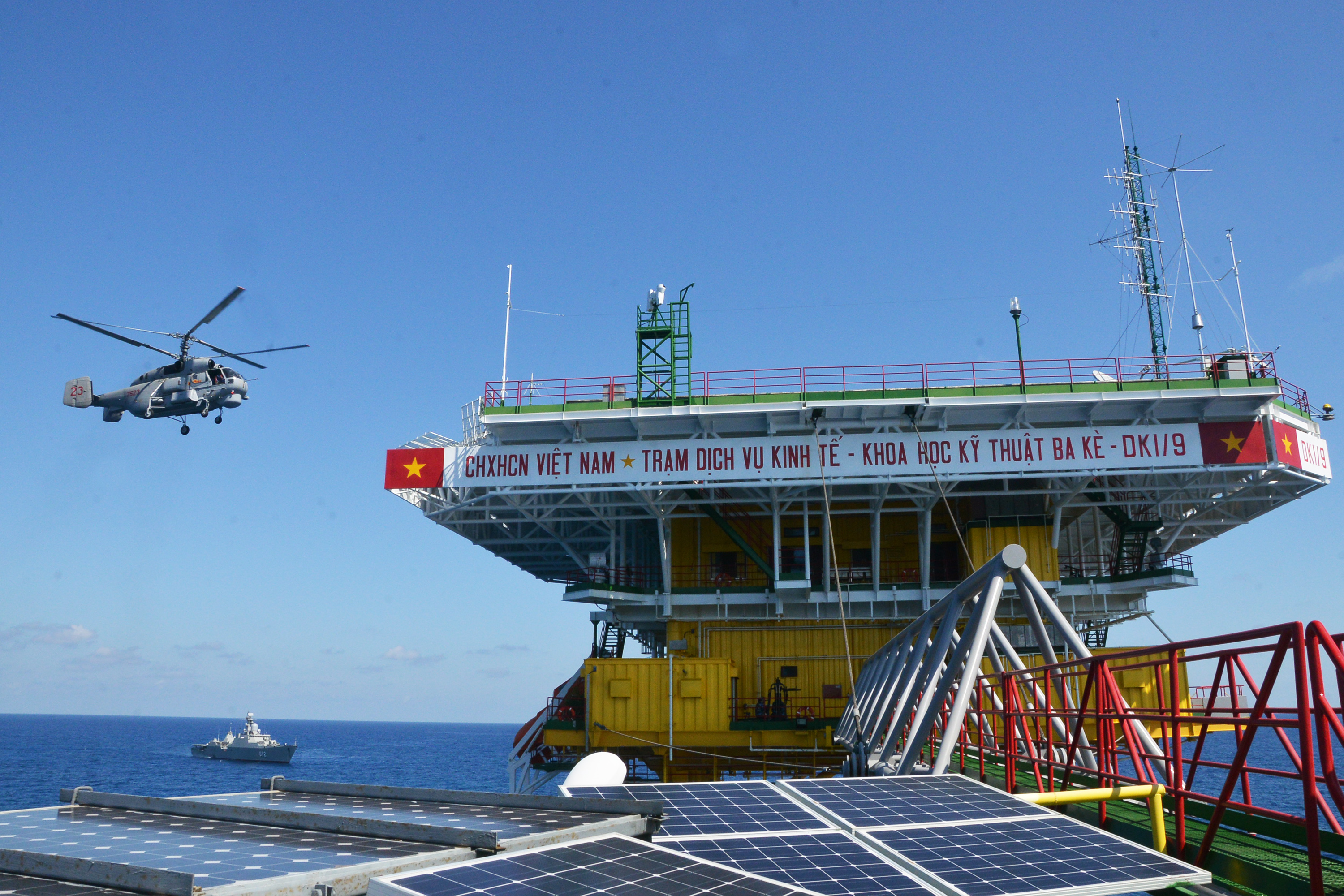 Trực thăng Ka-28 huấn luyện cất hạ cánh ở Nhà giàn DK1. Ảnh: Trọng Thiết