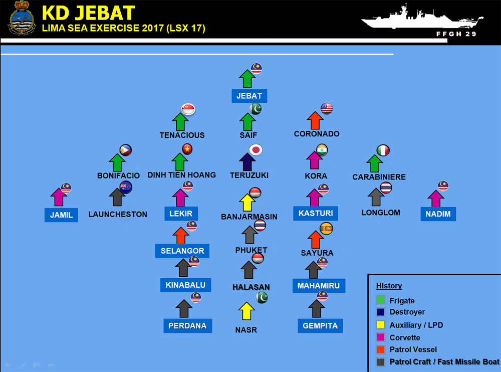 Chương trình diễn tập trên biển được triển khai với sự tham gia của 25 tàu chiến các nước, nước chủ nhà Malaysia có 10 tàu tham gia. Trong thời gian 3 giờ các tàu đã cơ động từ vị trí neo đậu đến vị trí tập kết. Tàu hộ vệ tên lửa Jebat của nước chủ nhà đi đầu đội hình giữ vai trò chỉ huy. Tàu Đinh Tiên Hoàng ở vị trí thứ 2 hàng thứ 3; phía trước là tàu hộ vệ tên lửa Tenacious của Hải quân Singapo; bên phải là tàu khu trục Teruzuki của Hải quân Nhật Bản. Các tàu vận động, tập hợp đội hình, hành tiến theo hình mũi tên với khoảng cách và tốc độ đồng nhất.