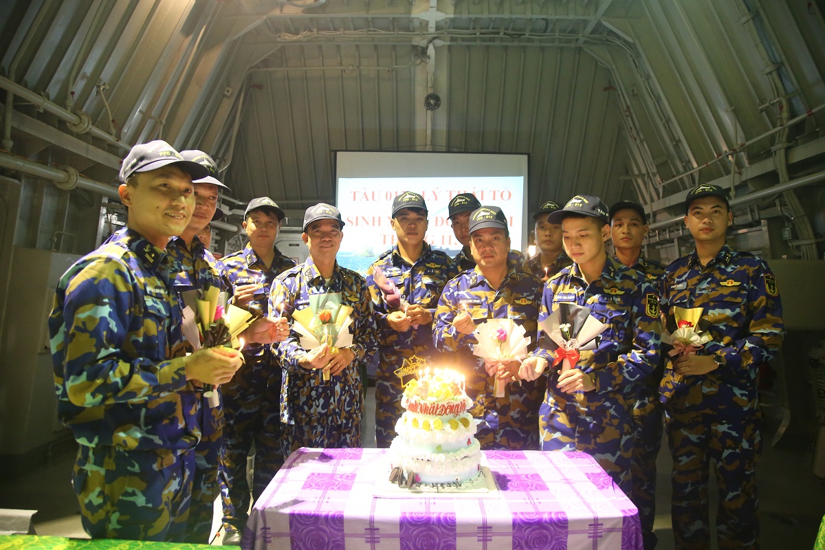 Sau những giờ làm việc hăng say, cán bộ, thủy thủ Tàu 012 đã có những giây phút chúc mừng sinh nhật đồng đội, tạo động lực và niềm tin hoàn thành xuất sắc nhiệm vụ
