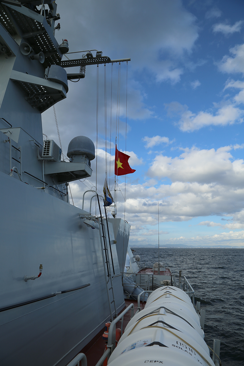 Cờ Tổ quốc và cờ Hải quân Việt Nam đã được hạ thấp để tưởng niệm đồng chí Đỗ Mười theo điều lệnh tàu Hải quân Việt Nam