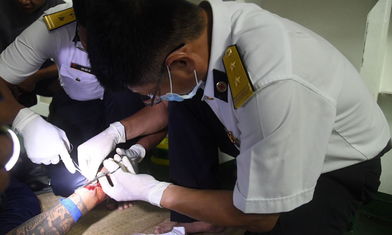 Tổ quân y Tàu 272 đã tiến hành thăm khám và chẩn đoán: Ngư dân bị vết thương mềm ở cổ mu bàn tay trái, dài 12cm bờ vết thương dập nát, nham nhở.