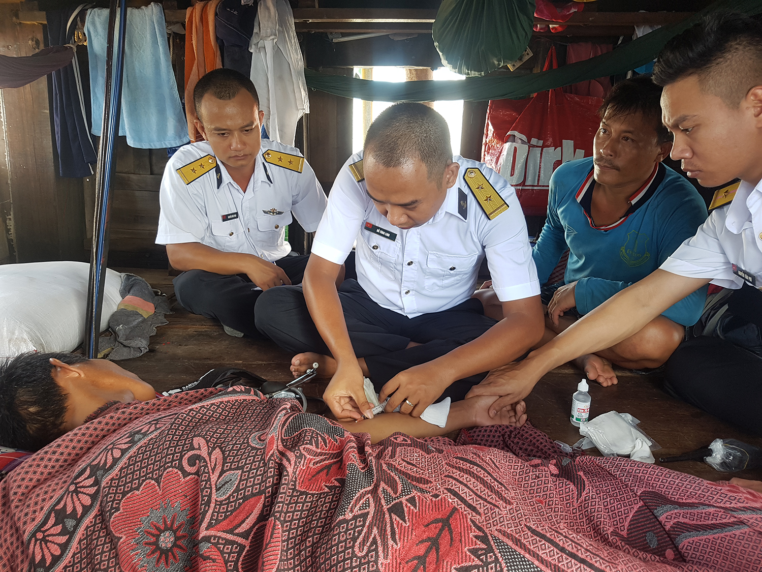 Ngay sau khi cập mạn, Tàu 278 đã nhanh chóng cử tổ quân y sang Tàu TG 93969 TS. Người bị nạn là ngư dân Nguyễn Văn Cường. Trong quá trình kéo lưới, anh Cường bị dây lưới đứt văng vào người và ngã đập đầu vào thành tàu gây bất tỉnh, chấn động não.