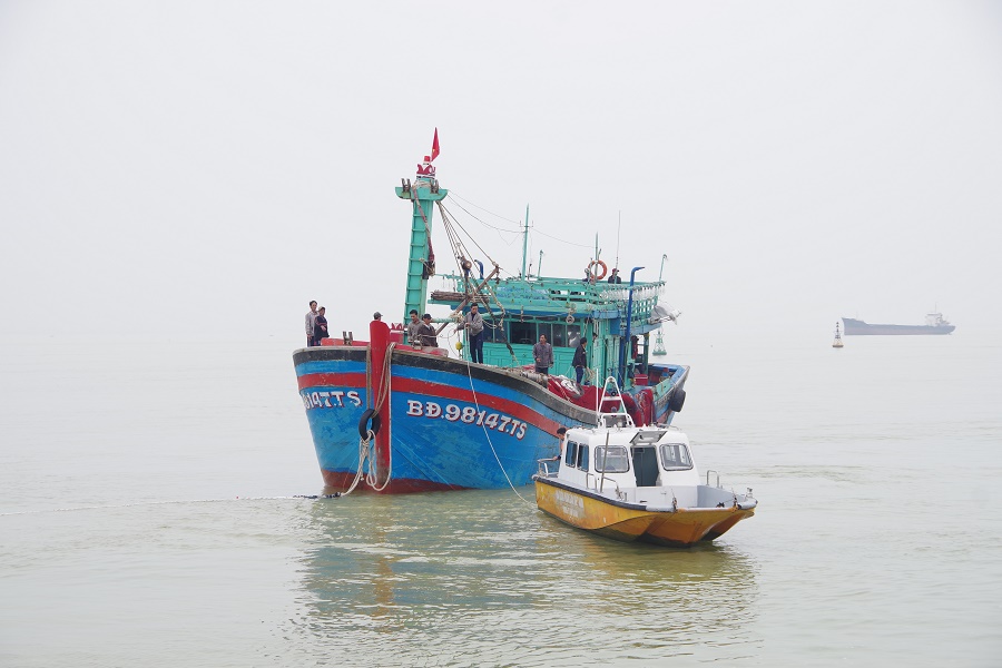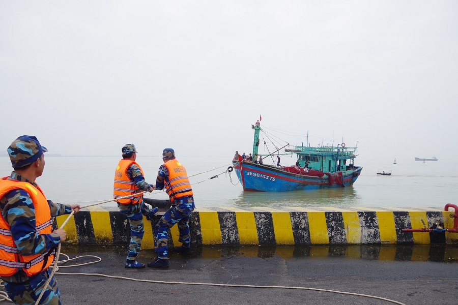 Cán bộ, chiến sĩ Vùng 3 làm dây kéo tàu cá cập mạn cầu cảng