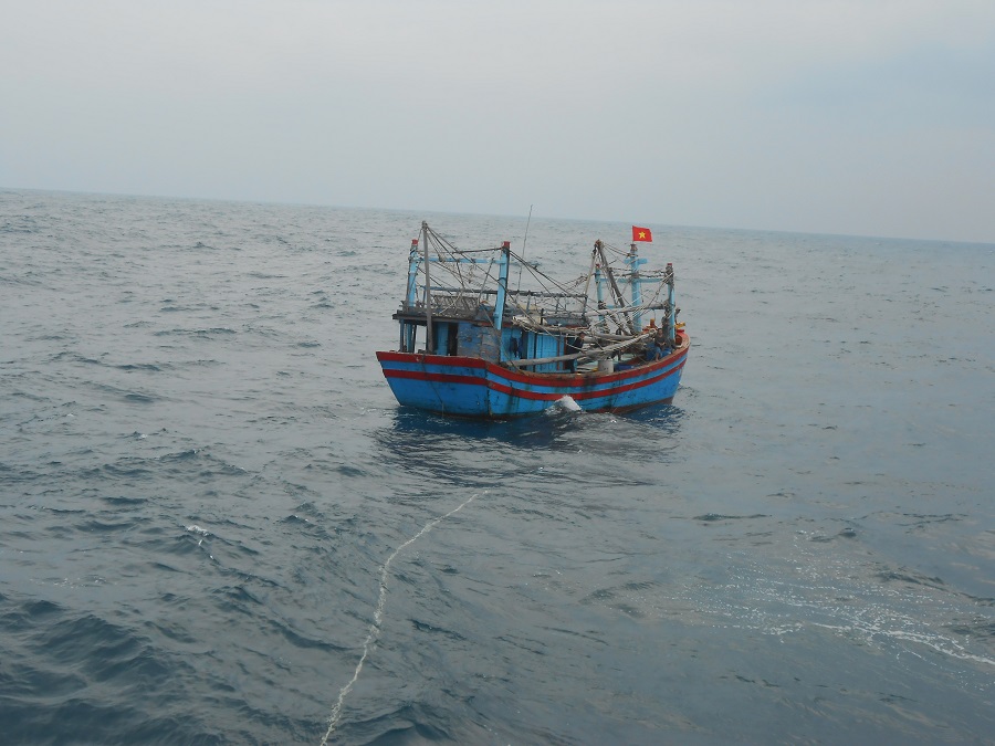 Tàu cá ĐNa 90305 TS đang được Tàu 363 lai kéo vào bờ