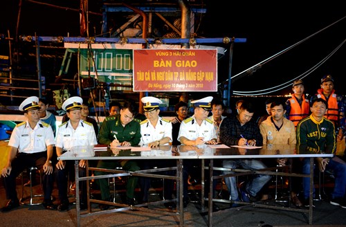 Cán bộ Vùng 3 bàn giao tàu cá cùng 11 ngư dân cho Bộ đội Biên phòng TP. Đà Nẵng
