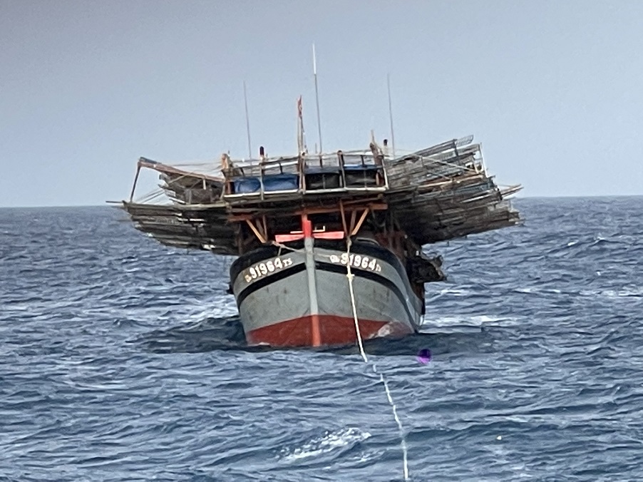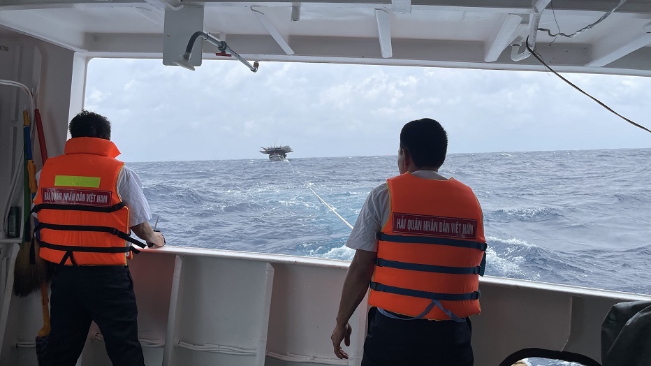 Sau 4 giờ cơ động, tìm kiếm, trong điều kiện gió Tây Nam cấp 6-7 và có mưa giông, Tàu 420 đã tiếp cận được tàu cá QNa 91964 TS và kéo về đảo Sơn Ca để sửa chữa.