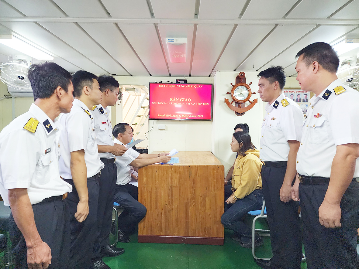 Đại diện Bộ Tư lệnh Vùng 4 bàn giao ngư dân cho cơ quan chức năng và gia đình