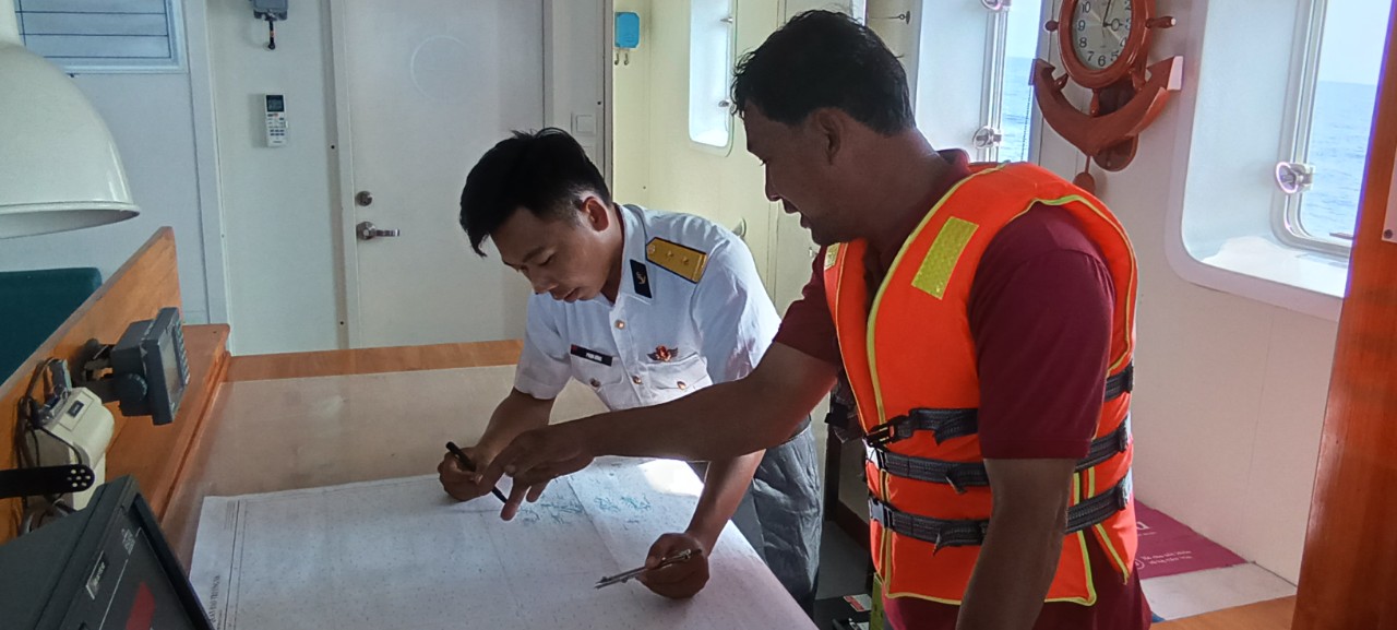 Cán bộ Tàu 465 cùng thuyền trưởng tàu cá PY 96239 TS xác định vị trí tìm kiếm