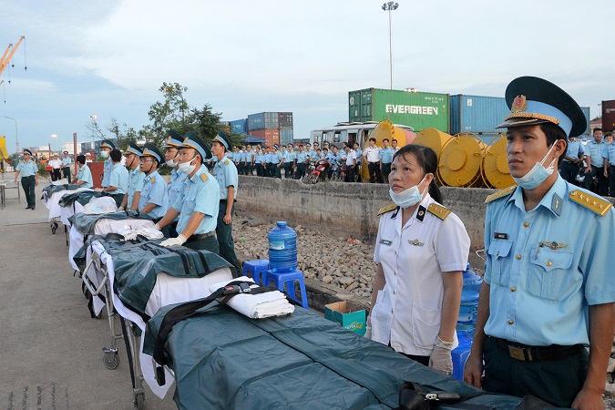 Đón tàu và đưa thi thể phi hành đoàn máy bay Casa 212 tại cảng có Trung tướng Nguyễn Văn Thanh, Bí thư Đảng ủy, Chính ủy Quân chủng Phòng không-Không quân; Chuẩn đô đốc Lê Minh Thành, Phó tư lệnh Quân chủng Hải quân; đại diện lãnh đạo, các cơ quan chức năng Quân chủng Hải quân và Quân chủng Phòng không-Không quân.