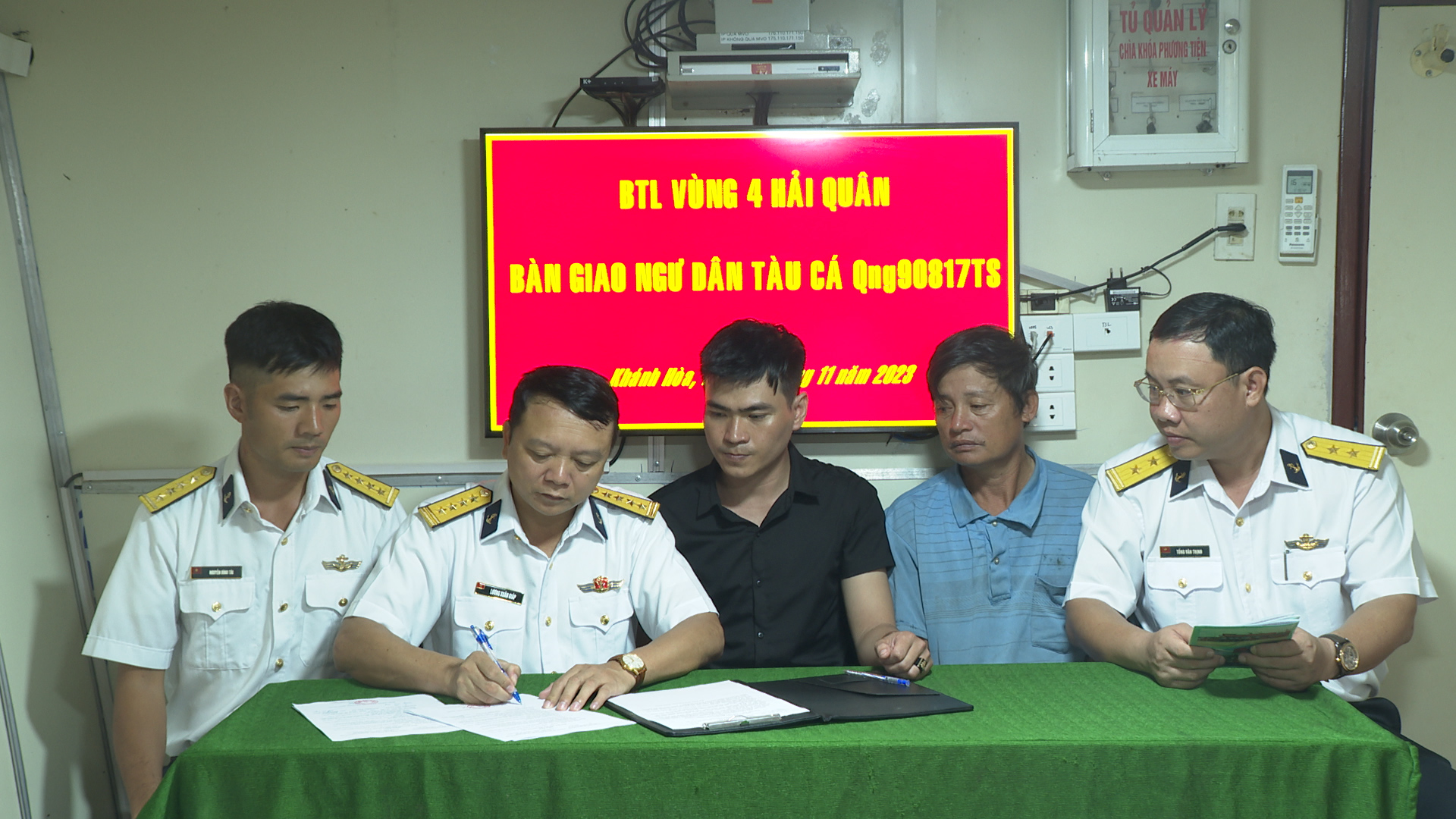 Cán bộ Vùng 4 bàn giao ngư dân cho gia đình và địa phương