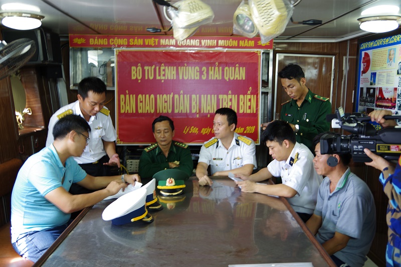 Đại diện Vùng 3 Hải quân bàn giao tàu cá và ngư dân cho Biên Phòng Quảng Ngãi