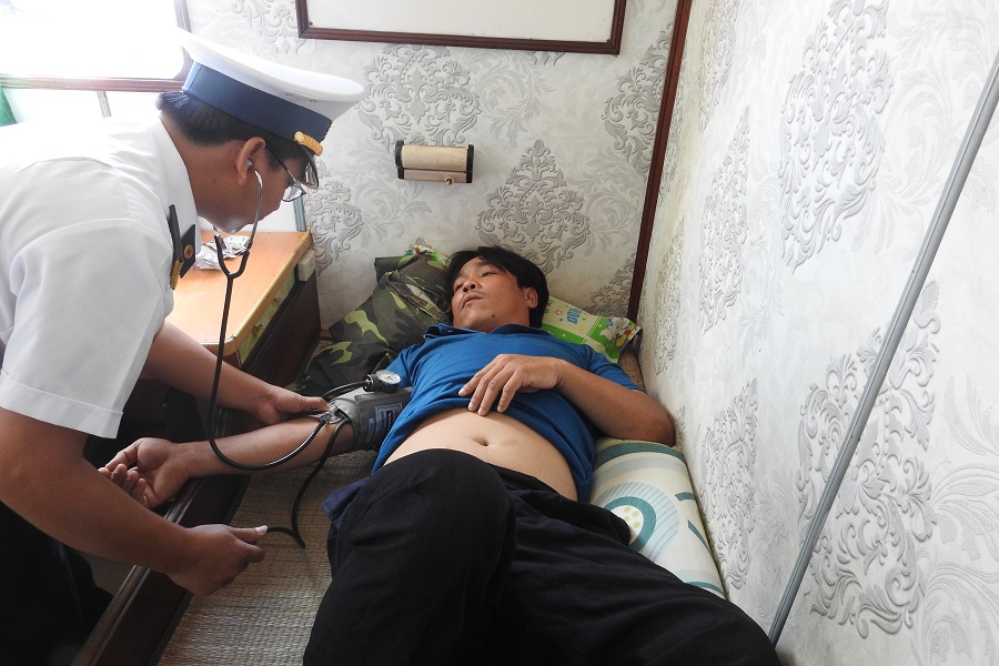 Tàu 640 đã phối hợp với quân y Nhà giàn 1/12 tổ chức thăm khám cho ngư dân tại tàu. Kíp quân y chẩn đoán ngư dân Ân bị đau dạ dày, đau nửa đầu, có triệu chứng mất nước và tăng huyết áp.