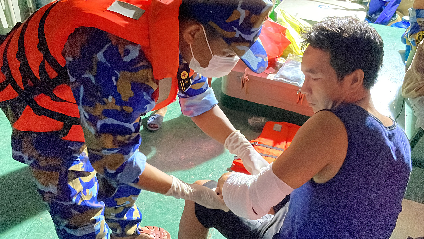 Bệnh nhân bị vết thương sâu, da nhợt nhạt do mất máu trong thời gian dài. Tàu 732 đã phối hợp với bác sĩ kiểm tra vết thương, băng bó, tiêm giảm đau và động viên ngư dân.