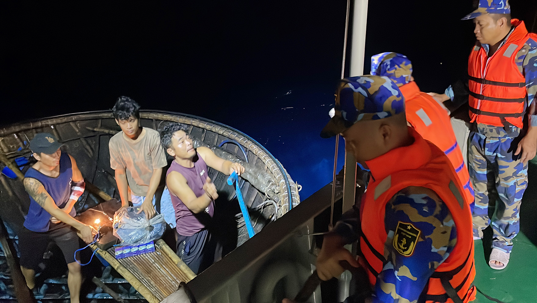 Đến 23 giờ 30 cùng ngày, Tàu 732 đã tiếp cận được tàu cá. Do tàu cá làm nghề câu mực, khó tiếp cận nên các ngư dân phải sử dụng thuyền thúng (mủng) để vận chuyển ngư dân bị nạn sang Tàu 732 để cấp cứu.