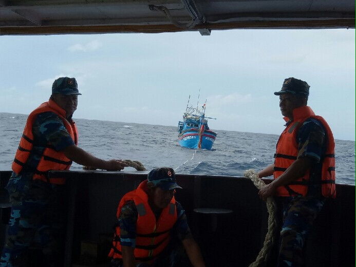 Tàu 737, Hải đoàn 128 lai dắt tàu cá PY 96265 TS bị nạn trên biển. Ảnh: Xuân Phương