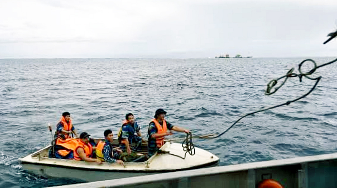 Anh Quang (người thứ 2 từ bên trái ảnh) theo xuồng lên Tàu 739 chữa trị
