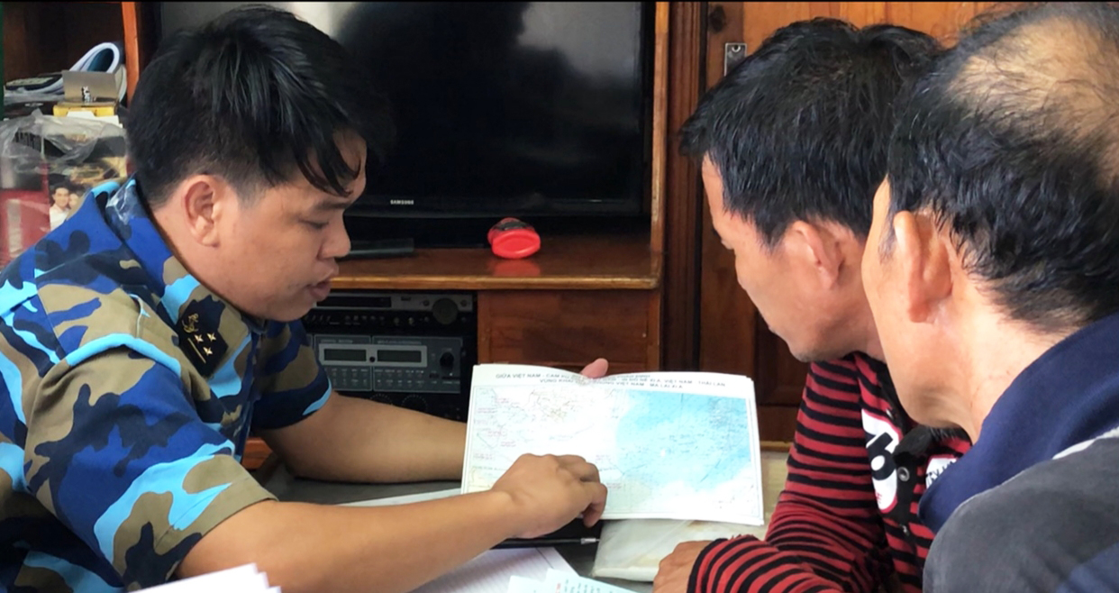 Cán bộ Tàu 740 hướng dẫn các ngư dân khai thác hải sản theo đúng luật pháp quốc tế và Luật Thủy sản Việt Nam