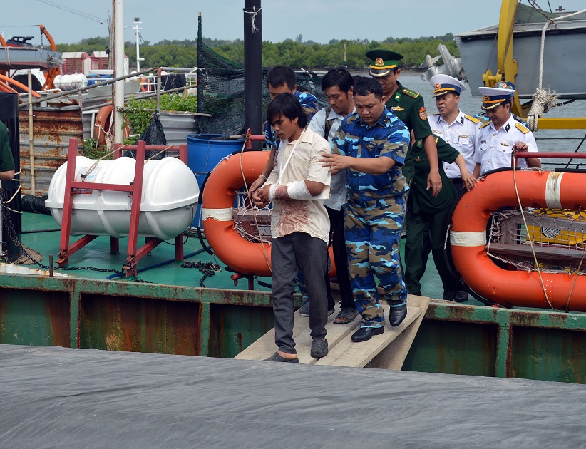 Ngư dân Trần Thành Minh được đưa từ tàu lên bờ