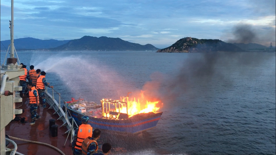 Lúc 5 giờ, Tàu 852 tiếp cận được tàu cá bị cháy phía trên gió, lúc này ngư dân trên tàu đã kịp thời di chuyển sang tàu cá khác do đám cháy quá lớn. Cán bộ, chiến sĩ Tàu 852 đã chủ động tiếp cận, giữ khoảng cách với tàu bị nạn, sử dụng 2 vòi rồng phía mũi phối hợp với 1 tàu, 1 ca nô của Bộ đội biên phòng tỉnh Khánh Hoà để dập cháy.