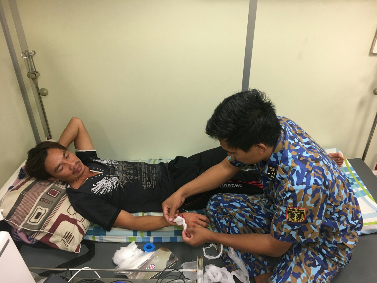 Bệnh nhân Cao Quang Đông được sơ cứu vết thương trên Tàu 924 trước khi chuyển lên Nhà giàn DK1/9