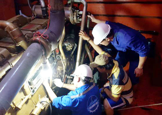 Cán bộ, chiến sĩ Tàu 937 sửa chữa máy chính cho tàu cá BTh 98974 TS
