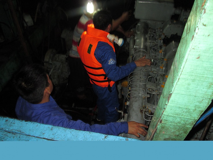 Nhân viên kỹ thuật Tàu 952 hỗ trợ kiểm tra khắc phục tình trạng máy tàu cá ĐNa 90307 TS. Ảnh CTV