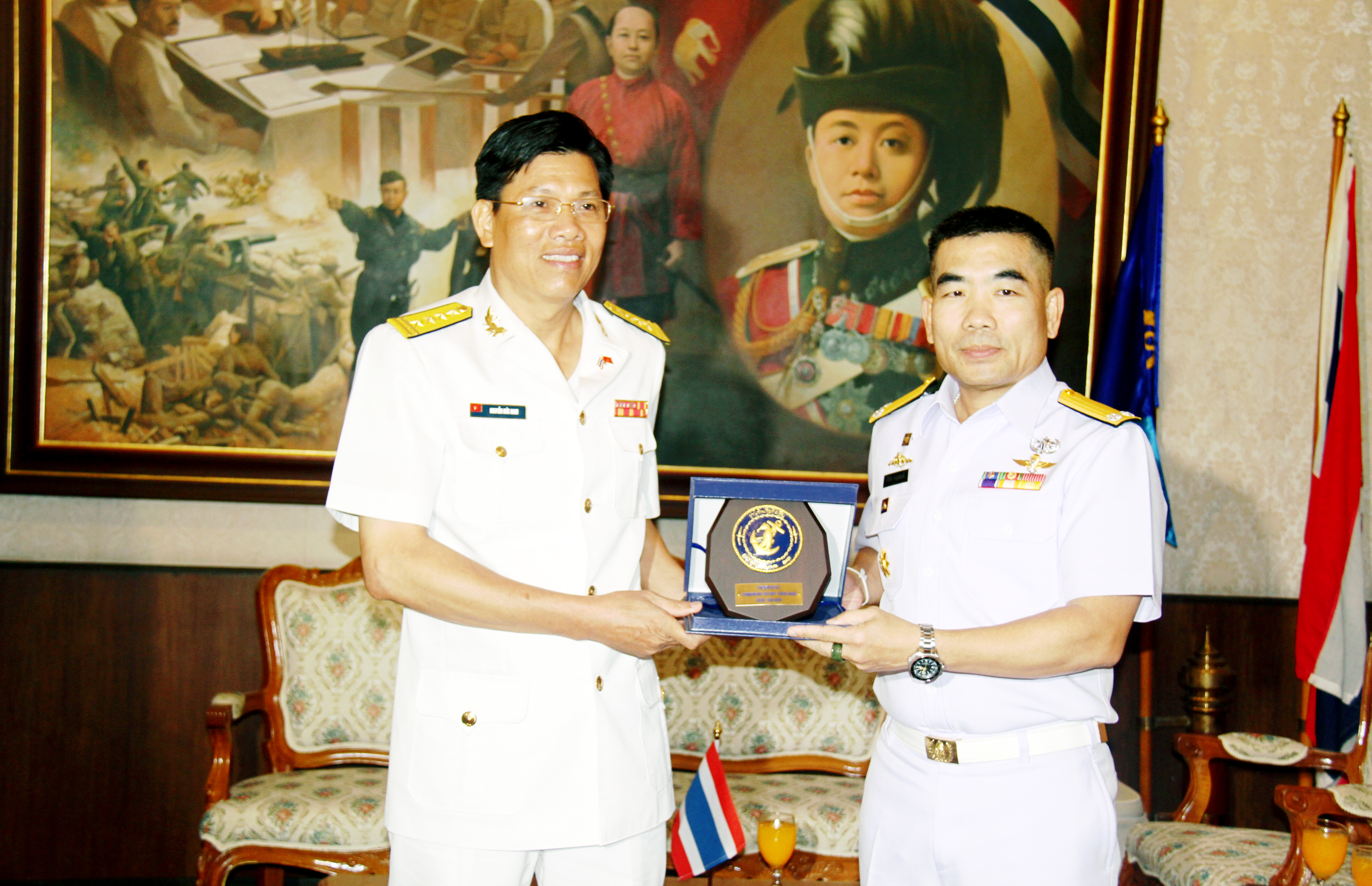 Chuẩn Đô đốc Siri chại trao quà lưu niệm cho Đoàn công tác Hải quân nhân dân Việt Nam