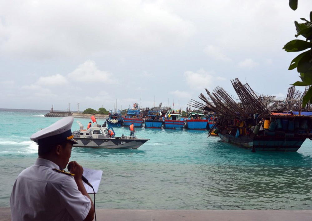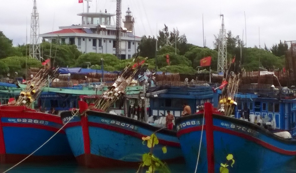 Chỉ huy đảo Song Tử Tây hướng dẫn các tàu cá vào âu tàu tránh bão