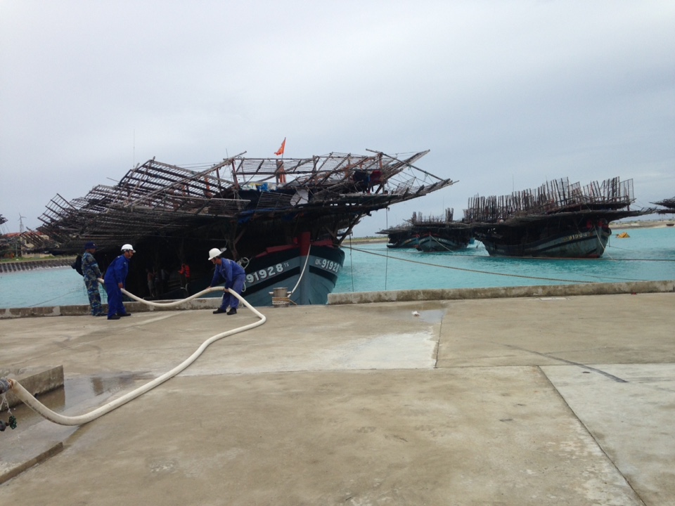 Đội dịch vụ âu tàu kịp thời bảo đảm nước ngọt, bán dầu và lương thực thực phẩm theo nhu cầu của bà con ngư dân. Đến chiều 15-10, đảo Sinh Tồn có hơn 30 tàu; đảo Đá Tây có 48 tàu, Song Tử Tây có 40 tàu, Đá Nam có 13 tàu, Đá Lát có 7 tàu, Song Tử Tây có 36 tàu... với hơn 1.700 ngư dân vào tránh trú bão an toàn.