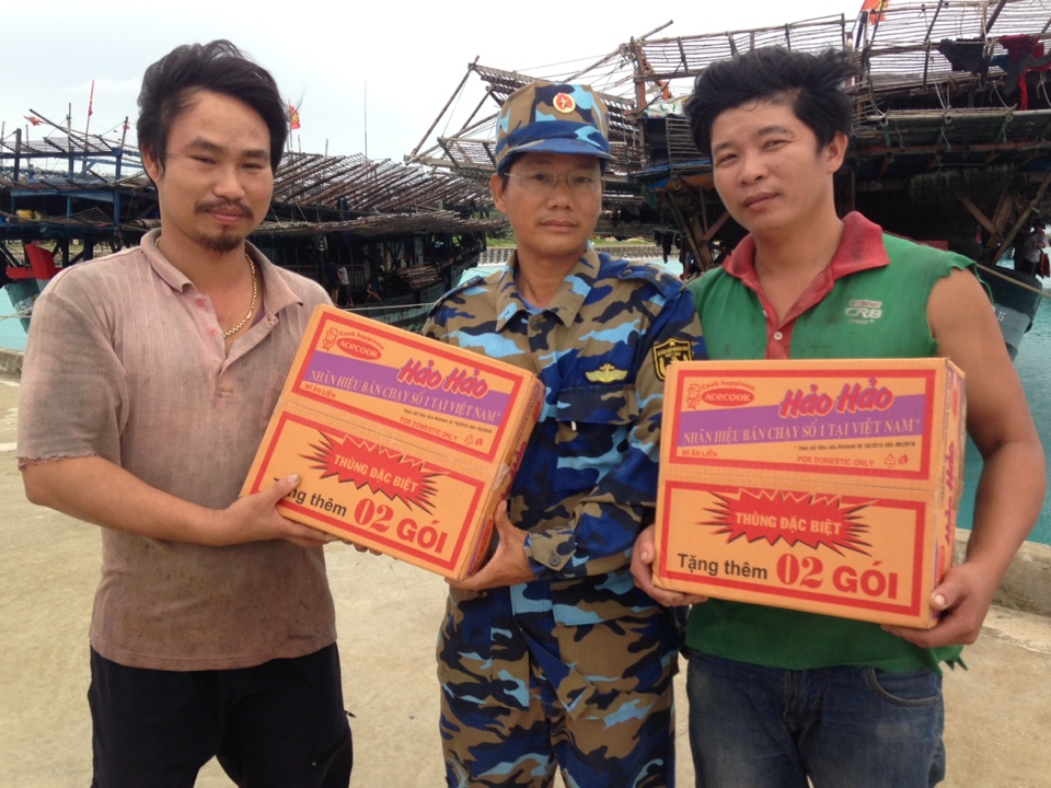 Cán bộ Trung tâm dịch vụ Hậu cần-Kỹ thuật đảo Sinh Tồn hỗ trợ mì tôm cho ngư dân