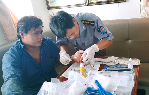 Ngư dân Lâm Trương Tâm bị dập đốt thứ 2 của ngón giữa bàn tay tay trái do tay bị cuốn vào dây cu-roa máy nổ. Nhân viên y tế Tàu KN 263 đã tiến hành cầm máu, rửa, băng bó vết thương và tiêm thuốc kháng sinh, chống nhiễm trùng cho bệnh nhân. Do vết thương có khả năng bị hoại tử phải tháo đốt ngón tay nên nhân viên Tàu KN 263 đã đề xuất ngư dân nên về bờ để tiếp tục điều trị.