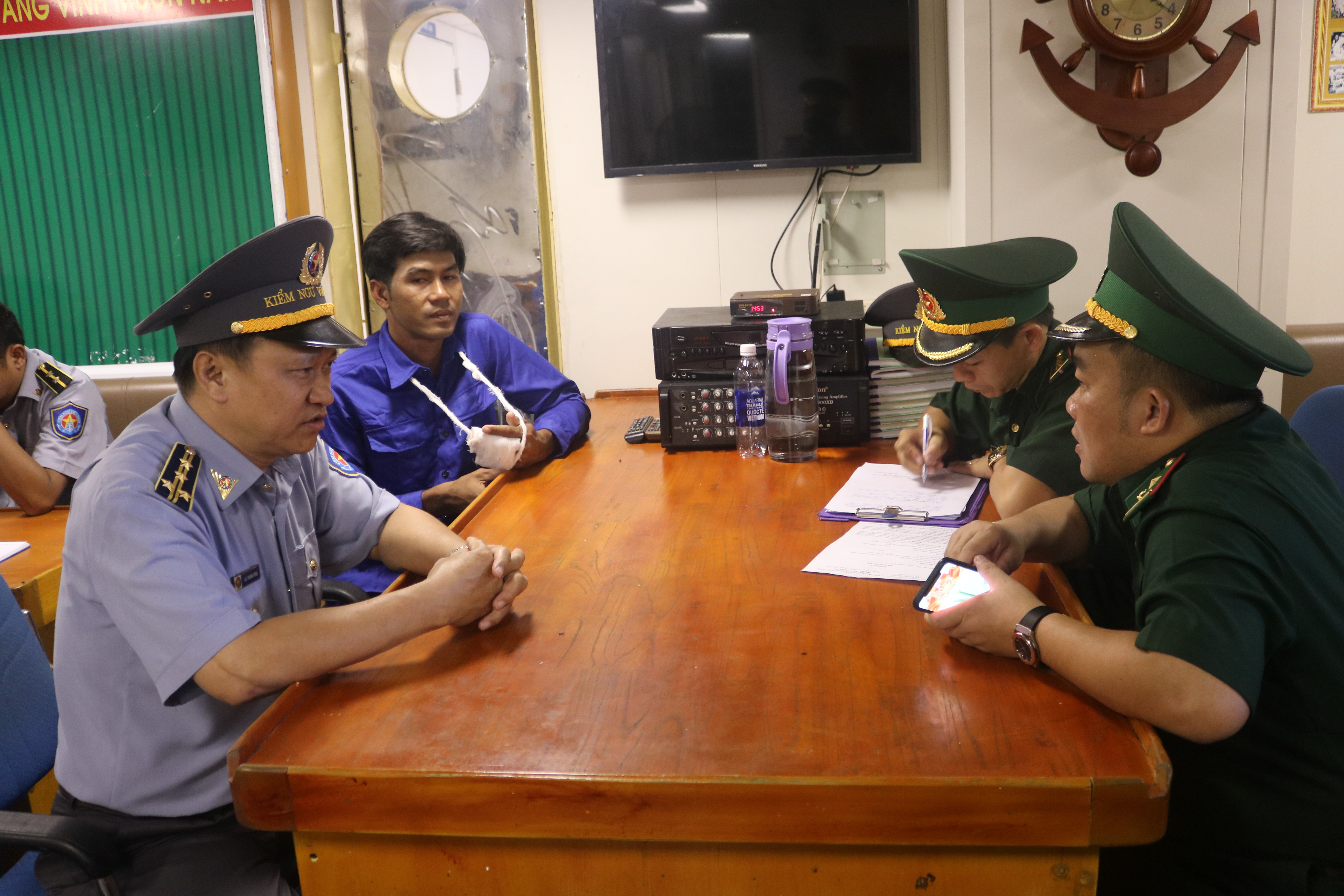 Trước đó, nhận được tin báo ngư dân Nguyễn Văn Phúc bị tai nạn lao động trên tàu cá BV 93986 TS, Tàu KN 267 đã cơ động, tiếp cận tàu cá BV 93986 TS và tiếp nhận, cấp cứu ngư dân bị nạn. Ngư dân Phúc bị dập 3 đốt ngón tay trên các ngón 3, 4, 5 của bàn tay trái. Nhân viên y tế Tàu KN 267 đã tiến hành sát trùng, làm sạch vết thương, băng bó và cấp thuốc điều trị.