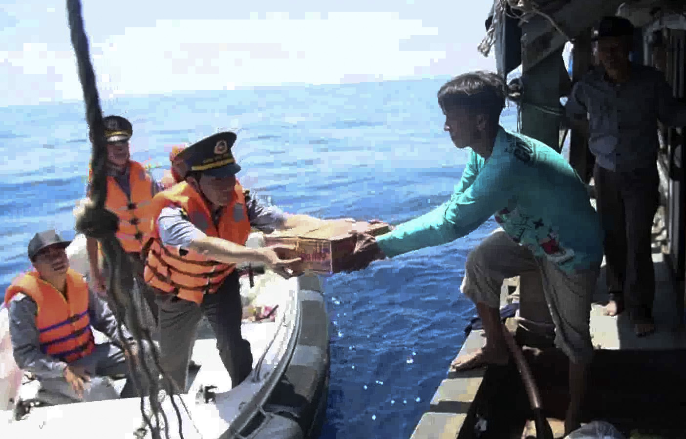 Đến 11 giờ 30 phút, sự cố chân vịt của tàu cá được khắc phục xong. Cán bộ, nhân viên Tàu KN 267 đã hỗ trợ một số nhu yếu phẩm cho ngư dân Tàu TG 90469 TS.