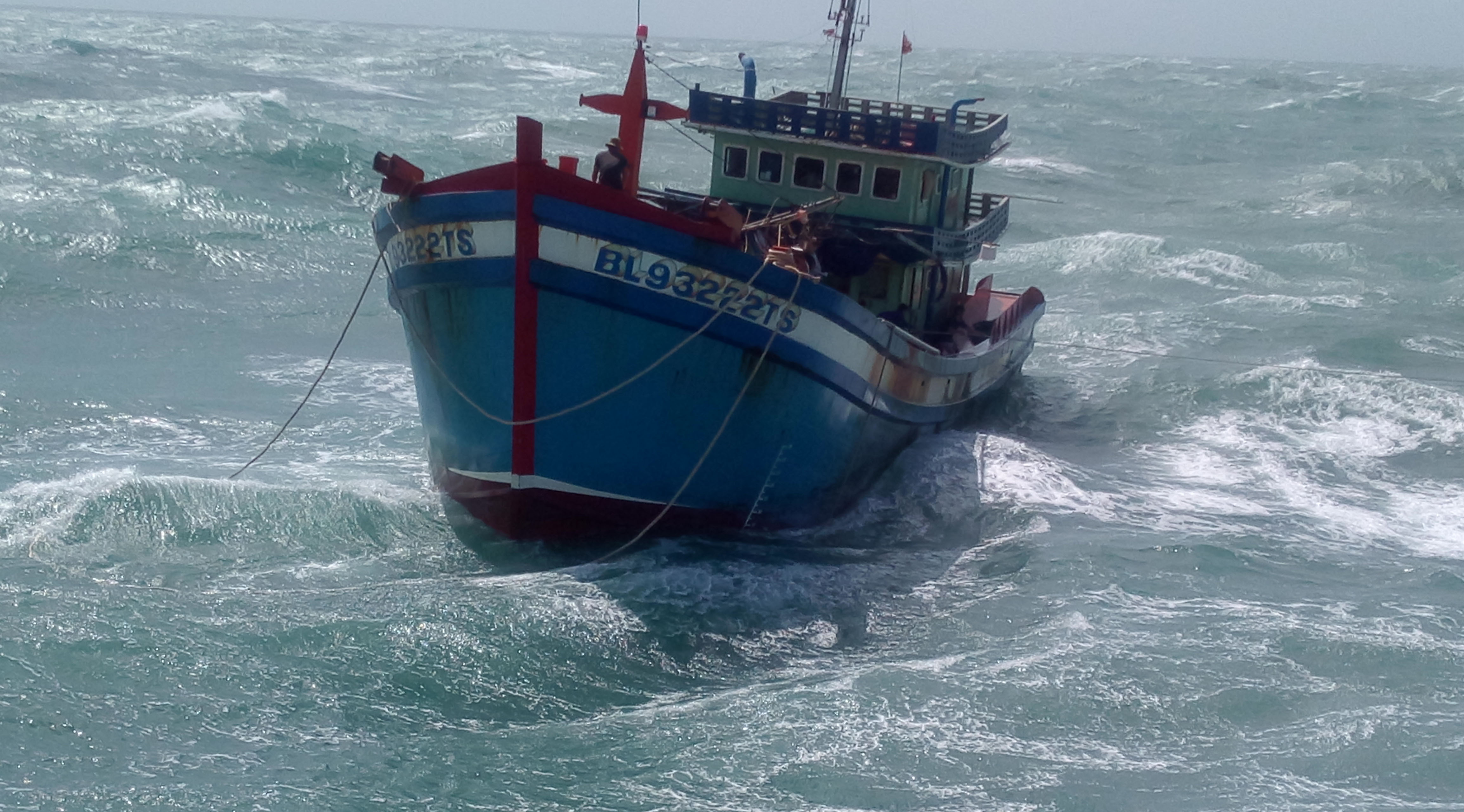 Tàu cá BL 93222 TS đang được Tàu KN 269 kéo về Côn Đảo