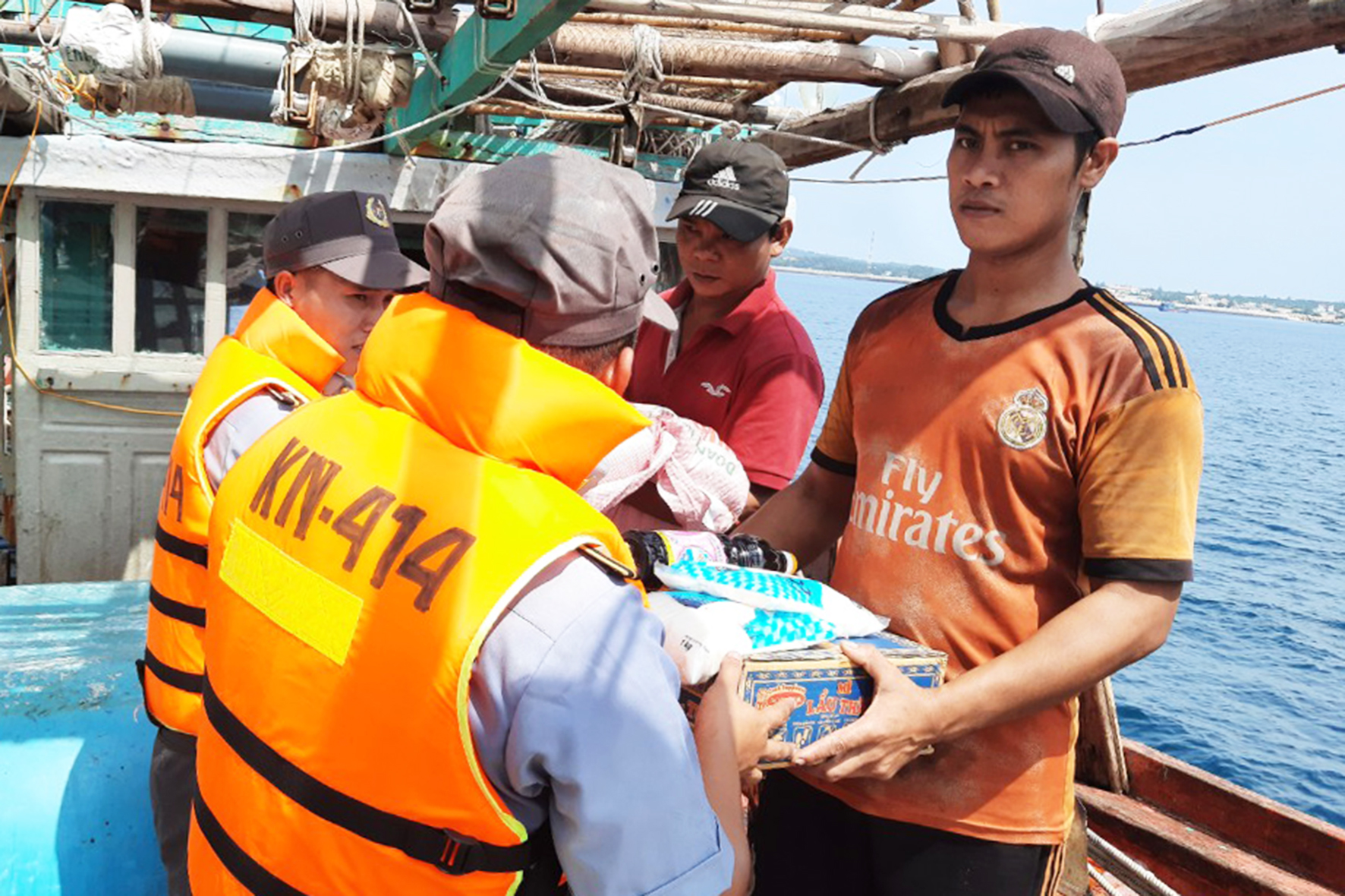 Nhân viên Tàu KN 414 cung cấp thực phẩm cho các ngư dân tàu BĐ 97865 TS