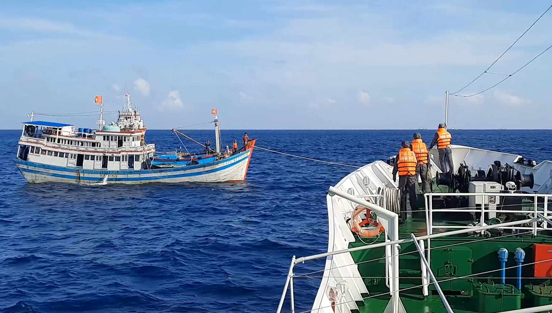 Tàu KN 417 lai keo tàu cá Bình Thuận về bờ an toàn