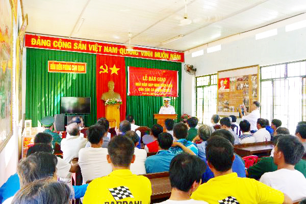 Đón ngư dân từ cảng vào Chi đội Kiểm ngư để bàn giao. Ảnh: Văn Hoàng