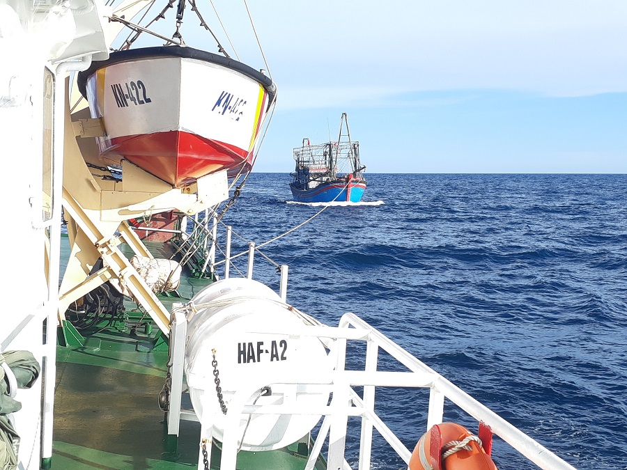 Đến 14 giờ 40 phút, Tàu KN 422 đã tiếp cận được tàu cá bị nạn và cử nhân viên kỹ thuật sang kiểm tra sự cố trục lái cho tàu cá.