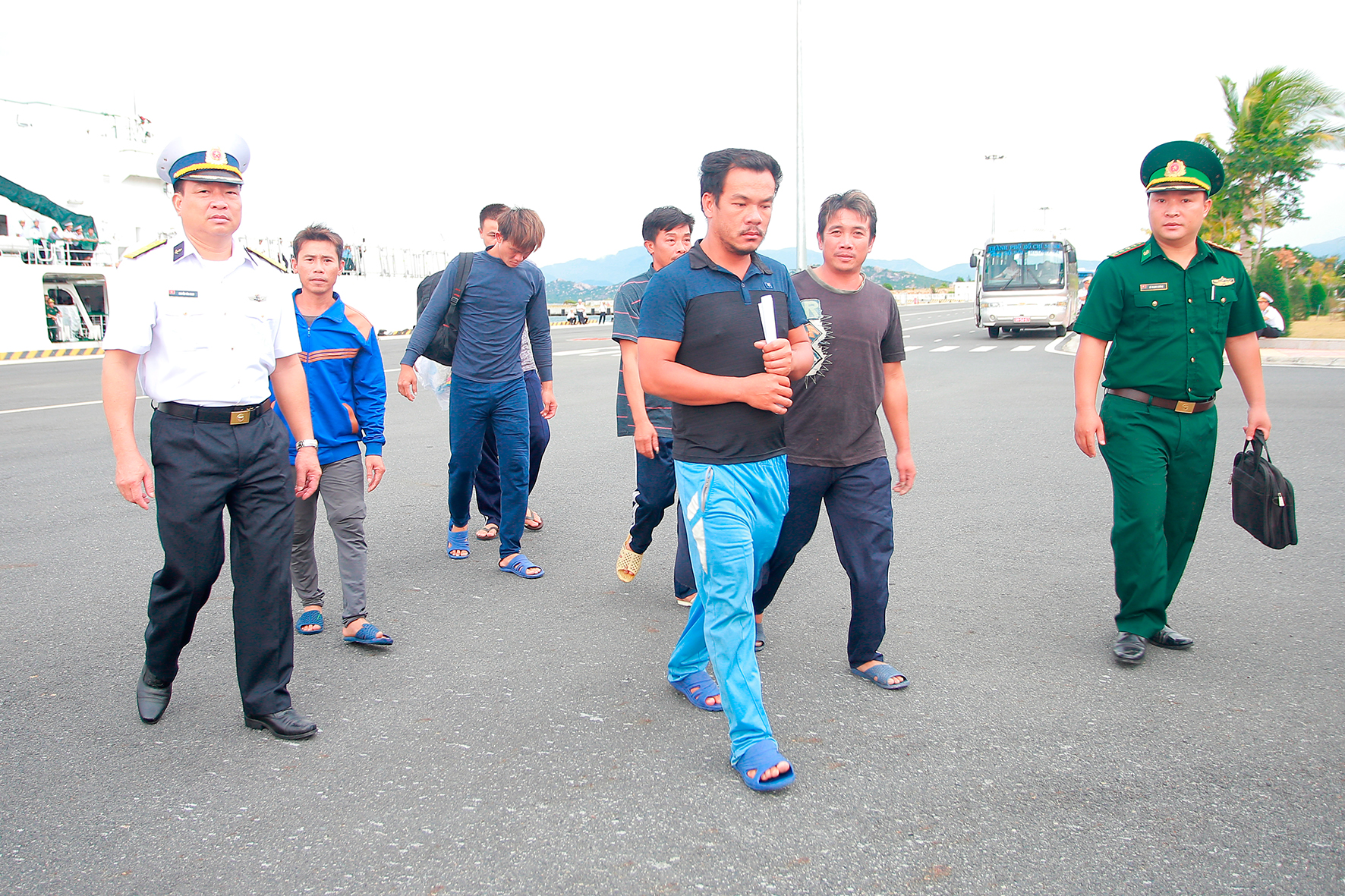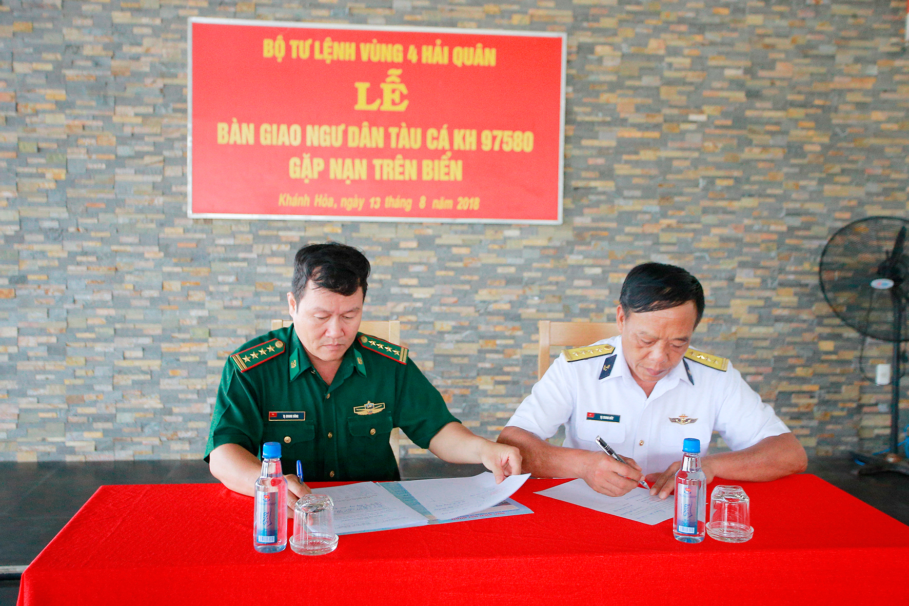 Đại diện Vùng 4 Hải quân và Biên phòng tỉnh Khánh Hòa làm thủ tục bàn giao 6 ngư dân