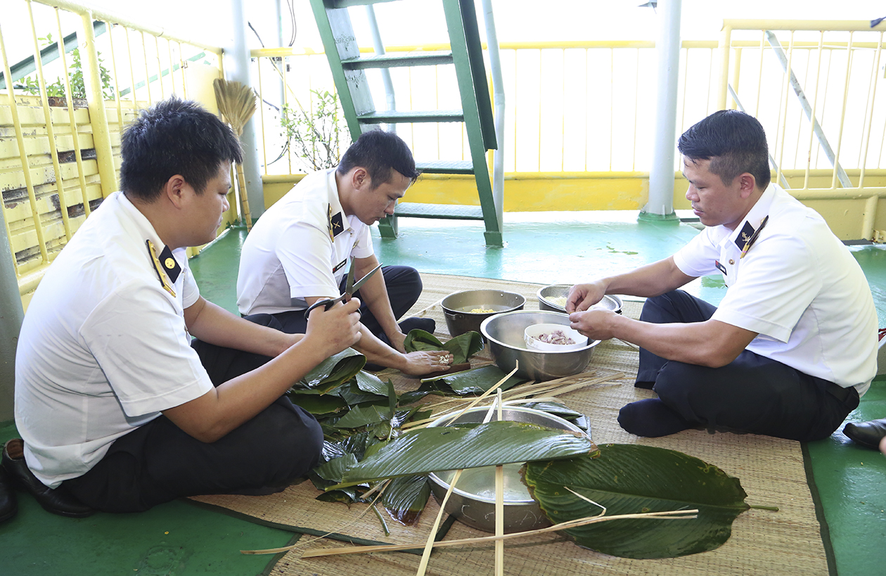 Gạo nếp, lá dong gửi từ đất liền cán bộ, chiến sĩ Nhà giàn DK1/10 tổ chức gói bánh chưng chuẩn bị Tết