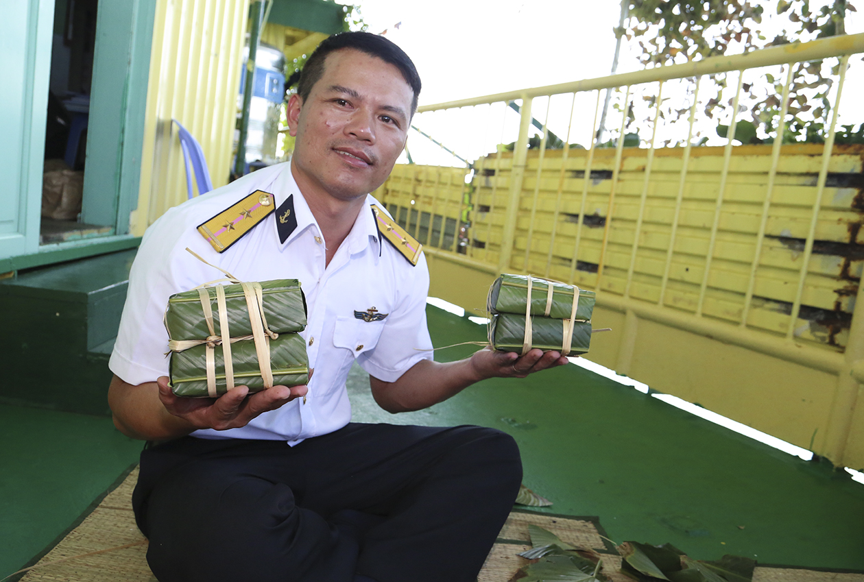 Niềm vui của Trung úy QNCN Lê Minh Tiến, Nhà giàn DK1/10 sau khi gói xong những chiếc bánh chưng