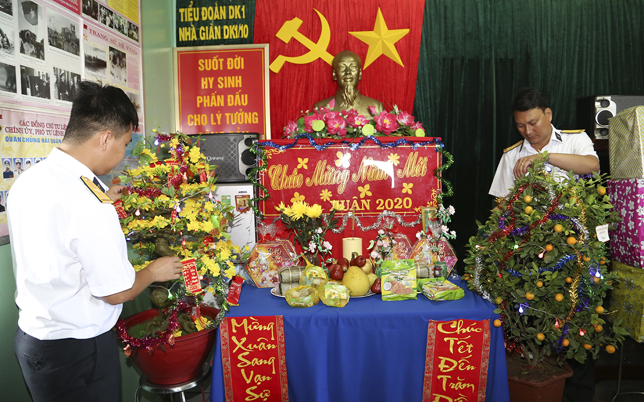 Bánh chưng xanh, cành mai vàng cùng những món quà đậm hương vị Tết cổ truyền đã được cán bộ, chiến sĩ Nhà giàn DK1/10 bày ngay ngắn trên bàn thờ Bác Hồ.