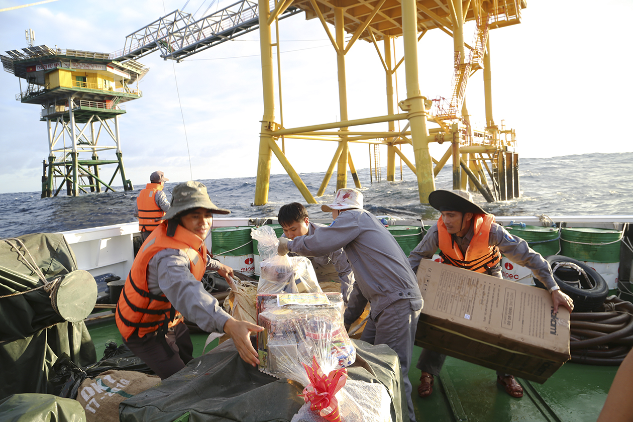 Vượt qua những cơn sóng trên cấp 6 của mùa biển động cuối năm, từng thùng quà được chuẩn bị đưa lên Nhà giàn